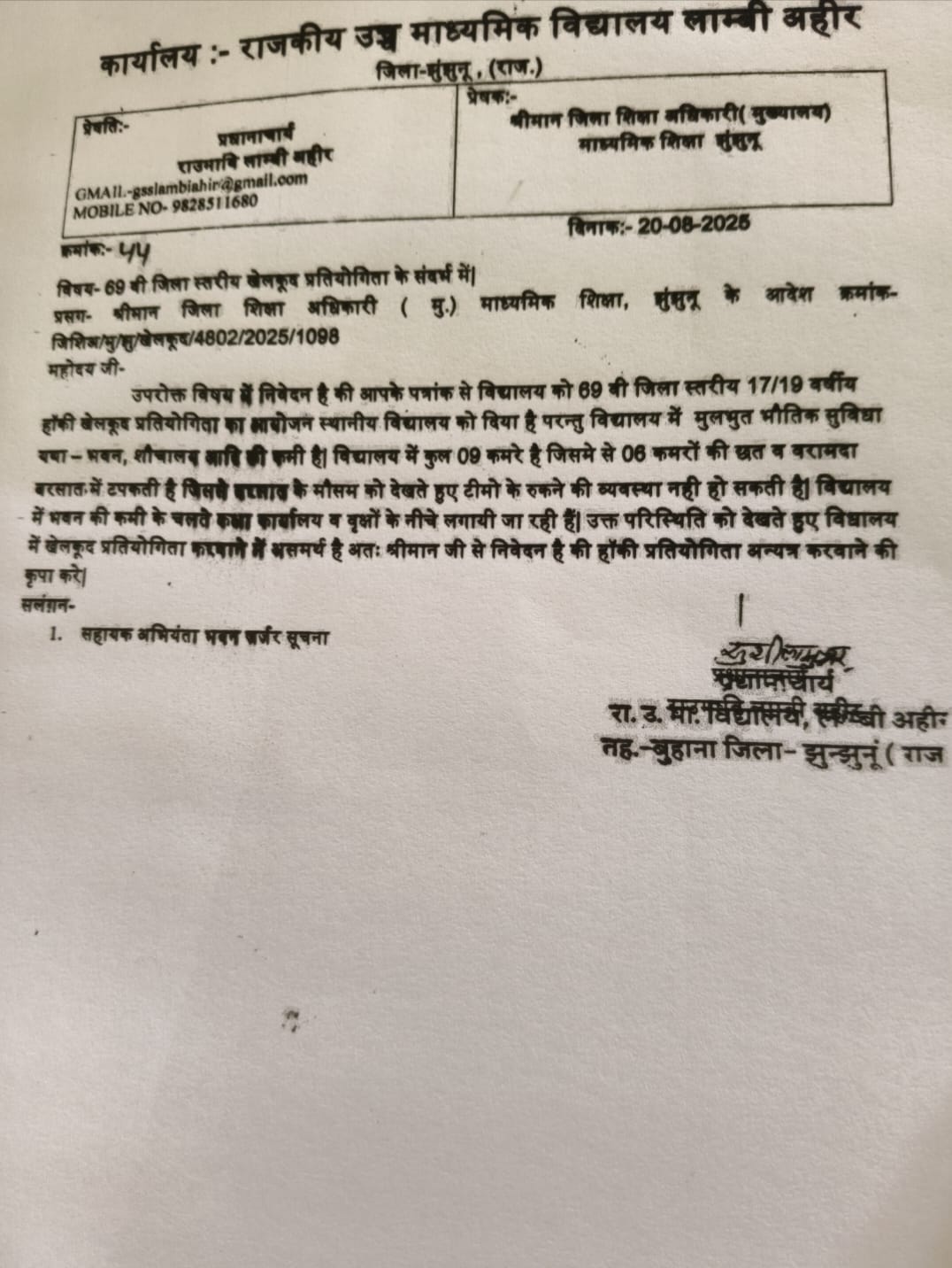 ग्रामीणों और खेल प्रेमियों का कहना है कि लंबी अहीर गांव में हॉकी प्रतियोगिता को लेकर जबरदस्त उत्साह था। उन्होंने शिक्षा विभाग के अधिकारियों से प्रतियोगिता यहीं कराने का आग्रह भी किया था और सहयोग का भरोसा दिलाया था। तब जाकर प्रतियोगिता आयोजित हुई। बावजूद इसके, प्रधानाचार्य द्वारा नकारात्मक रिपोर्ट देकर आयोजन को दिग्भ्रमित किया गया।